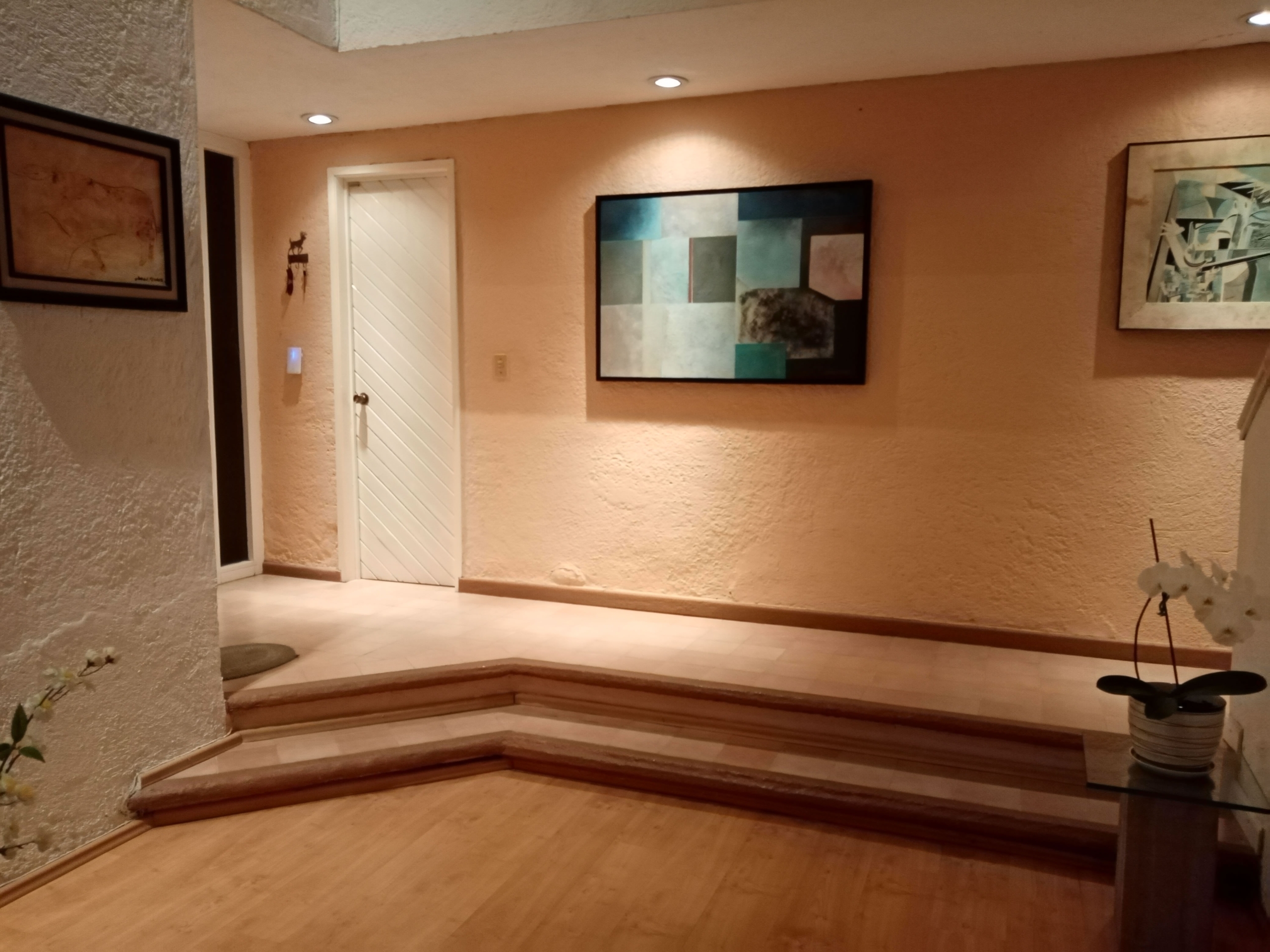 Segundo nivel (hacia arriba): Recámara principal con baño completo y vestidor, dos recámaras secundarias que comparten baño, área de TV
